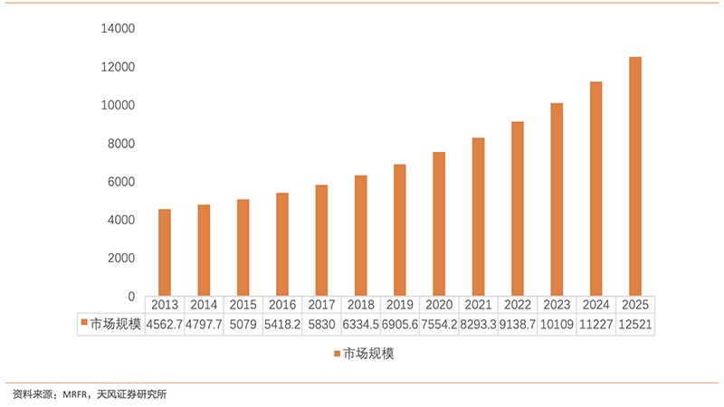 ▲2013-2025年FPGA市场规模增长情况(来源:天风证券)