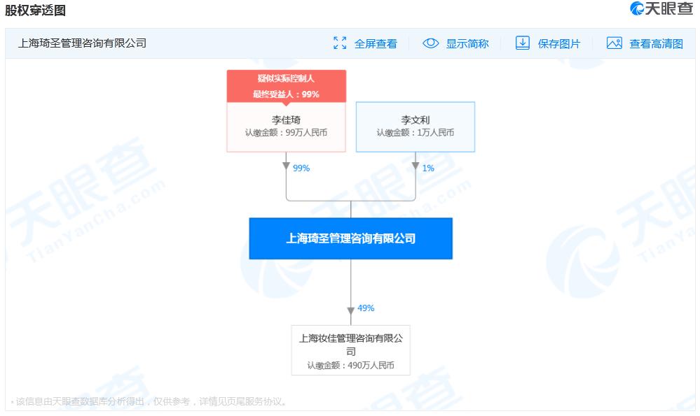 该公司大股东为李佳琦,持股比例99%;法定代表人李文利持股1%。