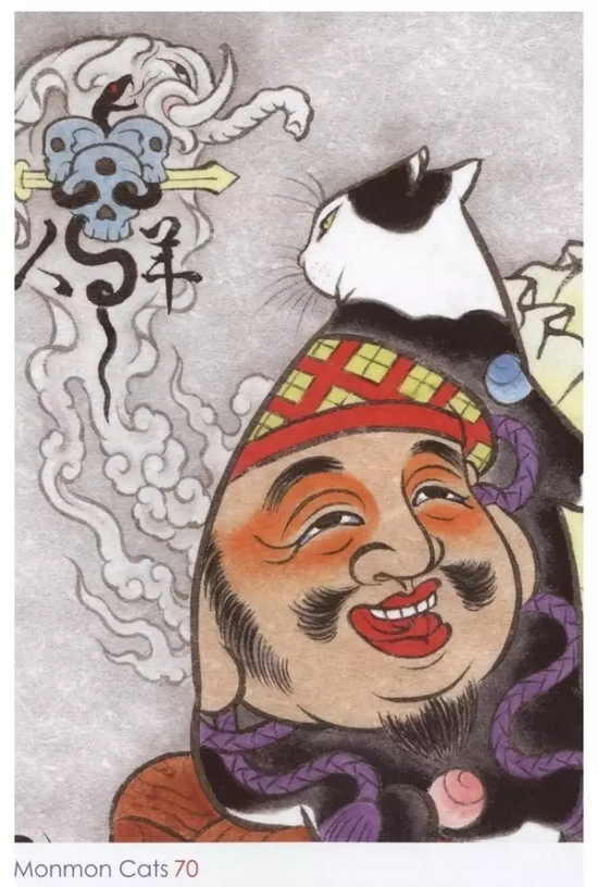 日式纹身中的宗教神鬼、浮世绘武士、龙、鲤鱼等题材,被巧妙的融入到了猫的形象中。