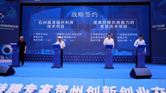 会上,副市长刘洪军就贺州创新创业环境进行推介。贺州市与千人计划南方创业服务中心举行了海创汇高层次人才培训中心·贺州分中心(筹)启动仪式,并为贺州市驻南创中心招才引智工作站揭牌,吸引更多高、精、尖、缺人才汇聚贺州,共同推动贺州高质量创新发展。国家特聘专家邹鸿志教授、李辉教授、汪峻峰教授、刘俊松博士分别与贺州市人民医院、贺州市临江房地产开发有限公司、广西利升石业有限公司、广西贺州市正丰现代农业股份有限公司,就“长安心”肠癌检测项目、海绵城市项目、石材废渣循环利用技术项目、提高脐橙抗病能力的育苗技术项目等项目签订合作协议。
