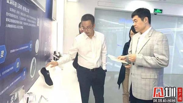 随后,调研组探访了深圳市孔雀计划展示交流中心,就中心设计规划与建设进展及优良成绩和人才团队的技术产品进行实地考察,现场体验了3D打印机、折叠屏手机、人体体征健康监测智能鞋子、激光投影机等智能设备。