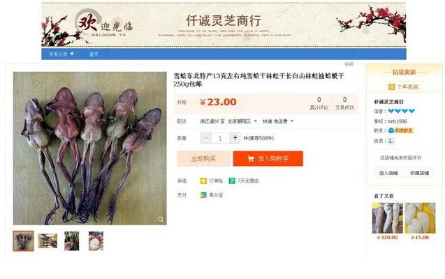 今天上午,第一财经记者登陆某电商平台发现,仍存在大量商家售卖东北长白山蛤蟆林蛙油、雪蛤膏、林蛙干的信息,也有不少商家售卖独角仙成虫、蝈蝈、螳螂、蜈蚣、马陆等野生动物活体。