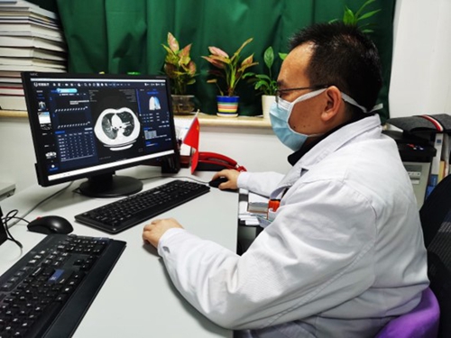 武汉大学人民医院放射科主任查云飞教授正在使用胸部CT新冠肺炎智能评价系统