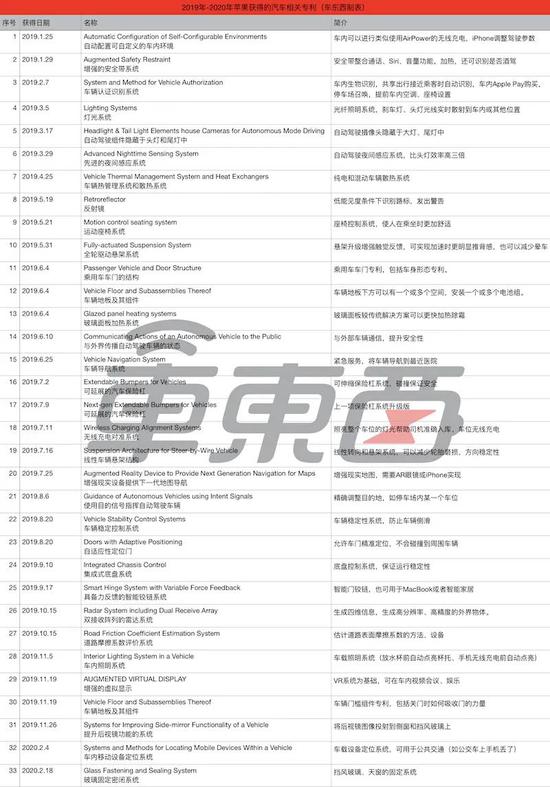 车东西汇总了2019年以来苹果在汽车领域获得的30多项专利,涉及自动驾驶、AR导航、车载VR、车内支付、生物识别、智能硬件、车外交互、虚拟后视镜等多个领域。