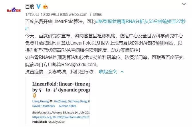 比如说,在疫情刚刚开始爆发的1月30日,百度就宣布向各基因检测机构、防疫中心及全世界科学研究中心免费开放线性时间算法 LinearFold,以提升新型冠状病毒RNA空间结构预测速度,从而助力疫情防控。