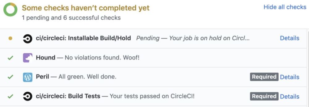 使用像 peril 和 hound 这样的自动化 code review 系统。Peril 可以检查代码更改,并根据预先配置的设置,标记警告和构建失败。例如,如果数据库迁移文件缺少 或包含不必要的 ,则 pull request 可能失败。你可以编写许多这样的检查和特定于团队的规则,并让 Peril 成为更改的“看门人”。HoundCI 可以做类似的事情,而且规则是完全可配置的。