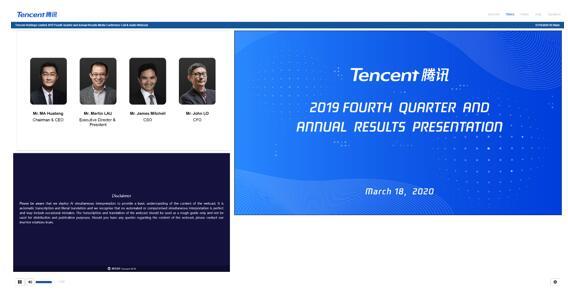 3月18日,腾讯召开2019年第四季度和全年业绩报告线上发布会,并首次使用自研的腾讯同传产品全程支持。业绩报告用英文发布,腾讯同传全程通过AI机器翻译完成了精准、流畅的转写和翻译服务,开创了全球首个上市公司财报发布使用在线AI同传的先河。