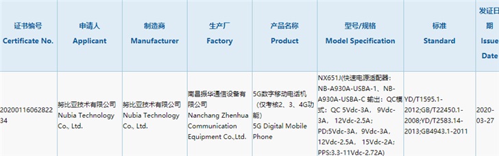 此前,一款型号为NX651J的努比亚5G数字移动电话机通过3C认证,这款手机应为将于4月15日发布的努比亚Play。申请人与制造商均为努比亚技术有限公司,生产厂为南昌振华通信设备有限公司,首次发证日期为3月27日。
