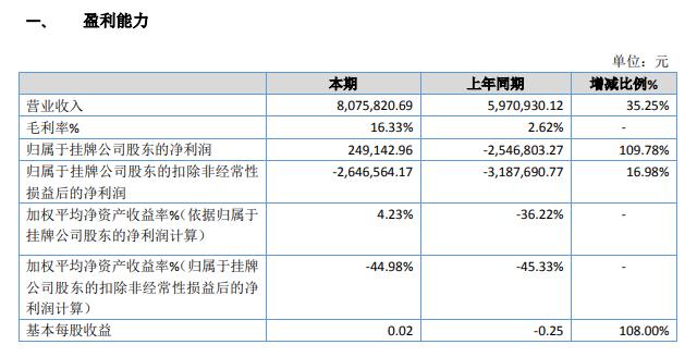 据了解,报告期内公司实现营业收入807.58万元,较上年同期增长35.25%;营业成本675.67万元,较上年同期增长16.21%;净利润24.91万元,较上年度同期增长109.78%。