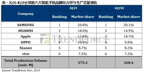 根据集邦咨询的最新数据,今年第三季度,华为手机第三季生产总量为6,750万支,季增13.4%,再次刷新纪录,达到全球18%的市场份额。而华为的强势增长对其他手机品牌构成了明显压力。