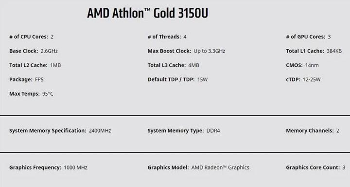 参数方面,速龙金牌3150U为双核四线程,主频2.6GHz,加速频率3.3GHz,15WTDP,14nm工艺。