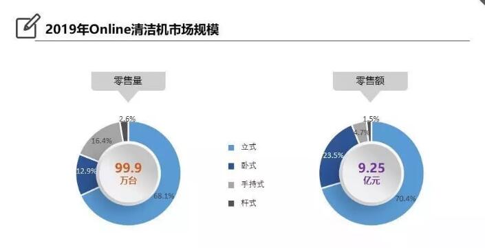 接下来出干货啦,家用清洁机市场有多大?据中怡康2019年全网零售监测报告显示,家用清洁机2019年累计线上销售99.9万台,销售额达9.25亿元,其中立式产品是支柱品类!从一定程度上代表着中国消费者对于拖布的依赖和信任。