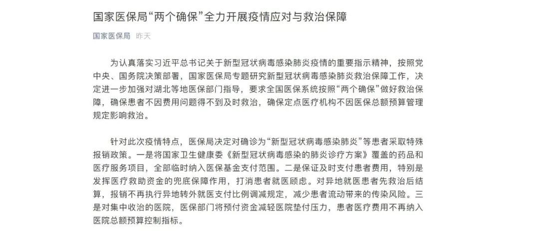 国家医疗保障局决定对确诊的患者基于特殊的报销政策,相关的医疗服务项目以及药品都临时纳入了医保基金支付范围,另外,异地就诊的患者也可享受先救治后结算的服务。