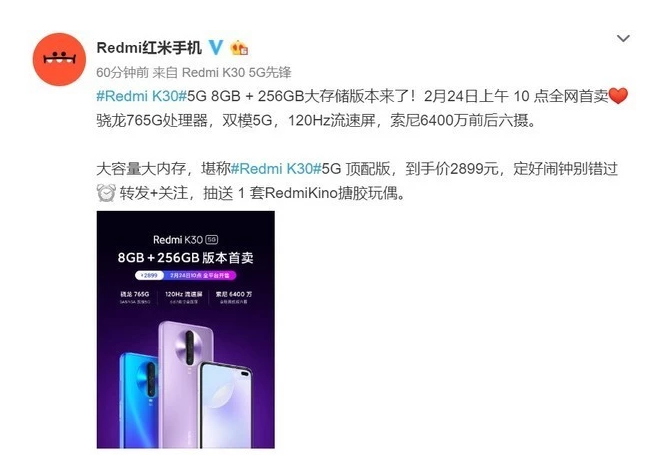 去年12月,红米手机正式推出了首款5G手机——RedmiK305G。据红米手机官微消息,RedmiK305G将推出8GB+256GB大内存版本,于2月24日上午10点首卖,售价2899元。