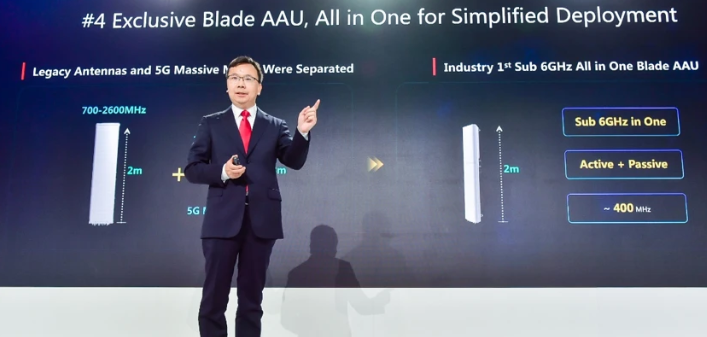 移动通信发展到今天,随着新制式的不断部署,天线模块越来越多,全球大多数运营商都面临天面空间不足问题。华为BladeAAU,以简驭繁,通过A+P一体化的设计,将5GMassiveMIMOAAU和2G/3G/4G无源天线模块集成一体,并将总高度控制在了2米左右。BladeAAU一个模块可同时支持Sub6GHz的所有频段,运营商可直接利用该产品替换原有的3G/4G天线,解决5G单天面部署的问题,同时该模块的集成化设计也将大大缩短站点安装时间,极大提升5G网络建设效率,缩短部署周期。该产品一经推出,已经受到全球多个运营商的青睐,并在瑞士、中国等多个商用网络中实现了商用。