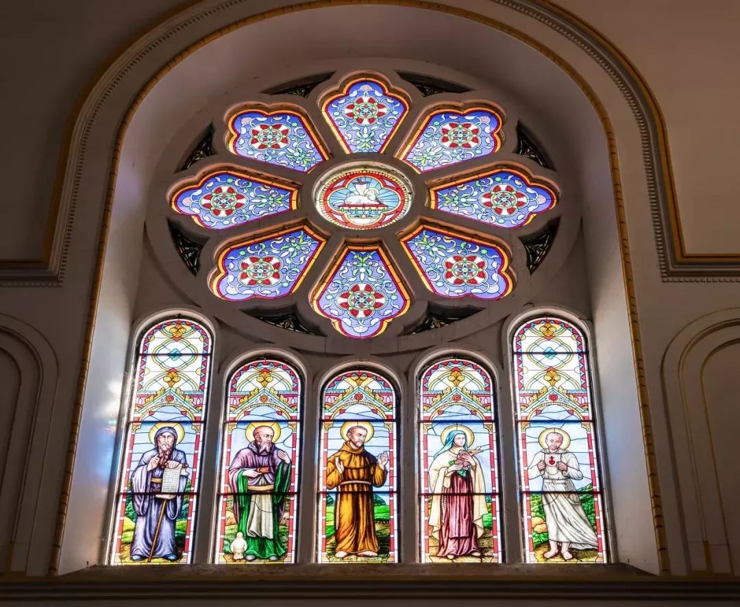 淡黄色的墙体,粉红色的屋顶上立着端正的十字架,圆拱形门扇,红色窗棱,简洁优美的图案,这一切显得色彩丰富又自然。
