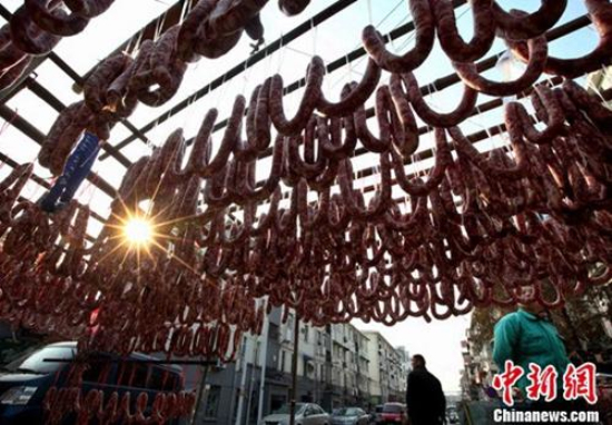 资料图:“小雪”时节 南京街头香肠成串。泱波 摄