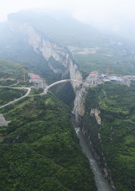 正进行主拱圈合龙施工的鸡鸣三省大桥(新华社)