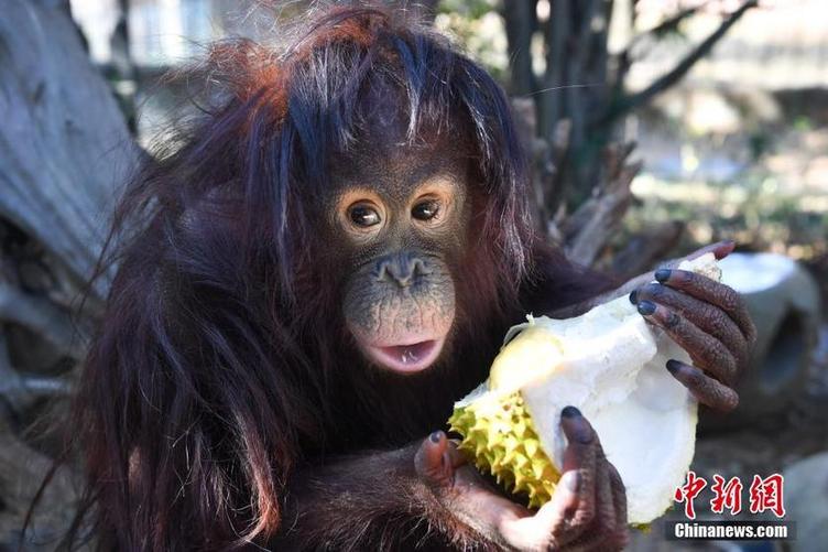 1月23日,随着春节临近,云南野生动物园的工作人员也开始为动物置办起了“年货”,给马来熊、山魈、环尾狐猴和红毛猩猩等喜欢吃水果的动物送上过年大餐。图为红毛猩猩吃榴莲。