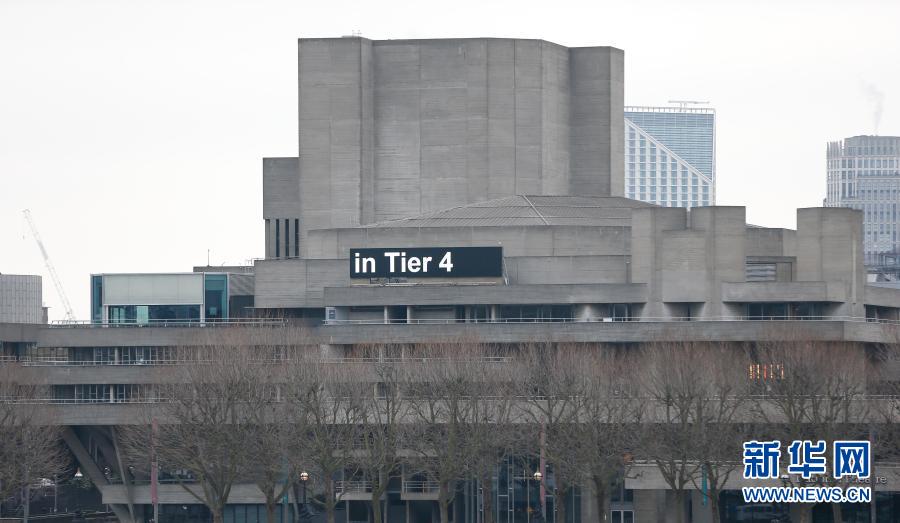 这是12月29日在英国伦敦拍摄的因疫情关闭的英国国家剧院。电子屏幕上显示伦敦处于英国疫情防控级别最高的第四级。