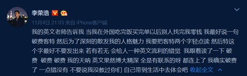 4日晚,李荣浩在微博写到近日学英文的趣事:“我的英文老师告诉我,当我在外国吃完饭买完单以后别人找完我零钱,我最好说一句破费客特,然后为了深刻的散发我的人格魅力,我要把客特两个字轻点读,然后特这个字最好不要发出来,若有若无,会给人一种英文流利的错觉 。我跟着读了一下,破费 、破费 、破费,我的天呐,英文果然博大精深,全是有联系的呀,都连上了,我确实破费了 。一点错没有,不要说我没教过你们,自己带到生活中去体会吧!”