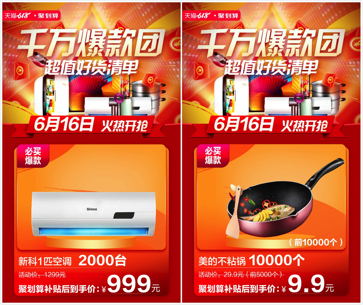 与戴森类似,国内知名空调品牌新科也加入这场品牌让利的消费盛宴。活动价1299元的新科一匹空调直降300元,前2000名购买者只需999元便能收获一个清凉的夏天。消费家电品牌美的,则拿出了10000个品质不粘锅,聚划算补贴后到手价只要9.9元。