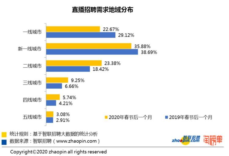 报告数据显示,直播人才招聘需求主要集中在一线与新一线城市。今年春节后一个月,直播招聘职位数占比前5位依次为广州、北京、杭州、深圳、成都。究其原因,一线城市的城市活力与人才流动性本身较大,而以“网红发源地”著称的杭州以及“网红打卡圣地”众多的成都也借由浓厚互联网氛围在新一线城市中脱颖而出。