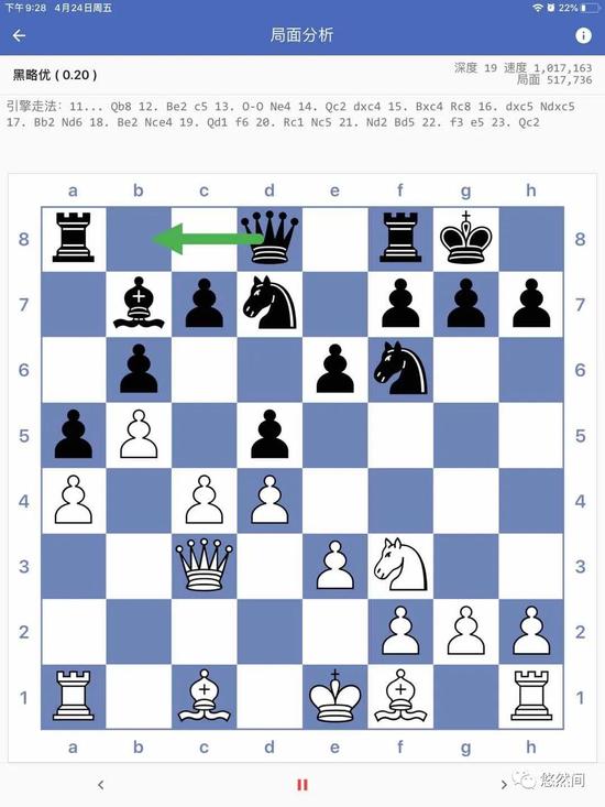 在此对局中,该棋手执黑。网络连接后,走出了11。。。Qb8!新招,这步棋在国际象棋历史上从未出现过,也是一步别具匠心的计划,其立意深远,实时观战的各位特级大师都直呼”妖艳“。这一盘就是前述视频中的对局,该白方全盘毫无还手之力。