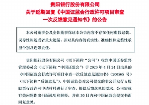5月21日,贵阳银行发布公告称,该行此前收到《中国证监会行政许可项目审查一次反馈意见通知书》,由于整体回复工作量较大,预计无法在30日内向证监会提交反馈意见的书面回复,因此该行已向证监会申请延期至7月23日前回复。