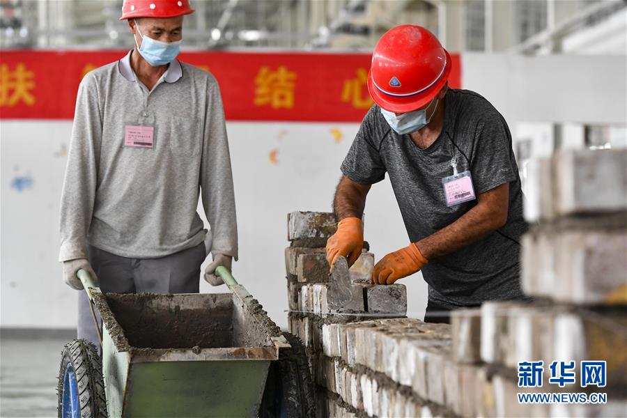 7月14日,新疆喀什地区巴楚县农民库尔班·阿布都瓦依提(左)和肉孜·艾克木在练习砌墙。 新疆喀什地区巴楚县面向农牧民开展多种就业技能培训,拓宽就业渠道,促进就业增收。据巴楚县人力资源和社会保障局介绍,结合各行业用工需求和农牧民意愿,该县已开设大型工程机械、砌筑工、木工、电工等14种技能培训。 新华社记者 马锴 摄