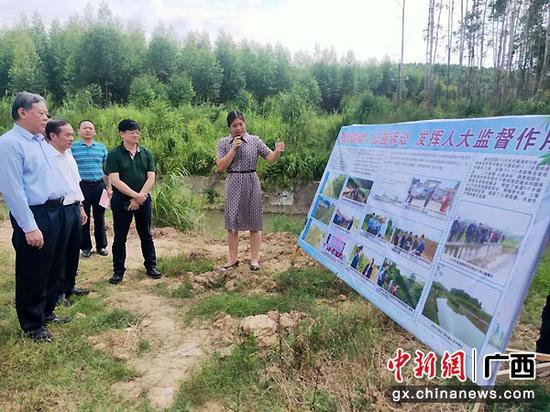 图为象州县人大常委会有关负责人向广西人大常委会调研组介绍罗秀河南北干渠相关情况。罗先彬 摄