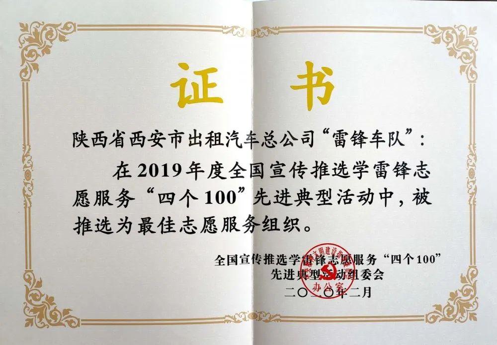 8月26日上午,由中共中央宣传部、中央文明办、全国总工会等部门评选的“2019年度宣传推选学雷锋志愿服务‘四个100’先进典型”结果公布。西安出租车行业西汽集团雷锋车队荣获“最佳志愿服务组织”荣誉称号,是全国出租汽车行业唯一获得此项荣誉的团队。