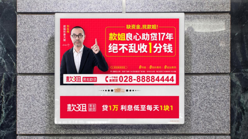 2019年6月22日,款姐携手刘仪伟的品牌形象广告全面登陆分众框架媒体。饱满的红色、代言人严肃的手势与表情,“良心助贷17年,绝不乱收1分钱”的核心品牌主张,都给人很强的内心震撼及视觉冲击。
