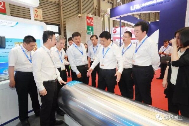 7月11日上午,滨州市委书记佘春明、副市长曹玉斌,邹平市委书记皮台田等滨州、邹平市领导和山东省铝业协会会长、魏桥创业集团董事长张波共同到国际铝工业展览会观展。