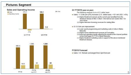 本财季,影视业务销售收入同比增长6%至1,861亿日元,受益于《黑衣人:全球追缉》和《蜘蛛侠:英雄远征》带来的院线收入增加以及影视资源的电视许可收入的增长,营业利润也大为改善。
