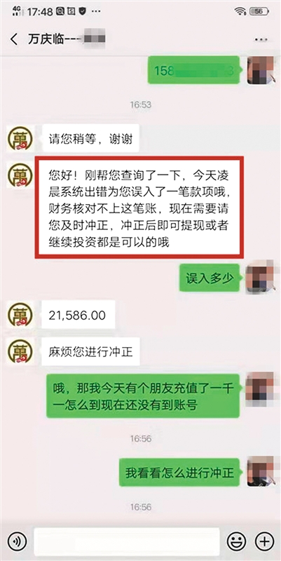 但是“意外”发生了,今年8月6日,万庆临公司的APP无法登录了,公司客服在微信上否认系统崩盘,并称凌晨时系统出现异常,错误地往投资者的账户里转入一笔款项,只要投资者及时“冲正”,即把错转入账户的钱退回万庆临公司的账上,就可以提现。
