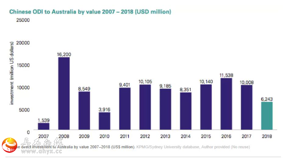 根据毕马威和悉尼大学商学院的研究,2018年中国在澳大利亚的投资相比上一年度的130亿澳元下降了36%,至82亿澳元。这份年度报告分析了2018年中国对澳洲的直接投资情况,并表示虽然当下中国对澳投资力度有所减缓,但中国仍认为澳洲是一个安全和有吸引力的投资目的地。