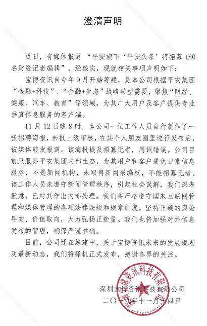 宝博资讯就平安头条招聘回应:非新闻机构 定位