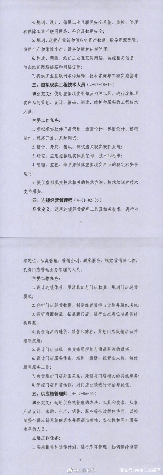 据了解,16个新职业为智能制造工程技术人员、工业互联网工程技术人员、虚拟现实工程技术人员、连锁经营管理师、供应链管理师、网约配送员、人工智能训练师、电气电子产品环保检测员、全媒体运营师、健康照护师、呼吸治疗师、出生缺陷防控咨询师、康复辅助技术咨询师、无人机装调工、高铁线路综合维修工和装配式建筑施工员。