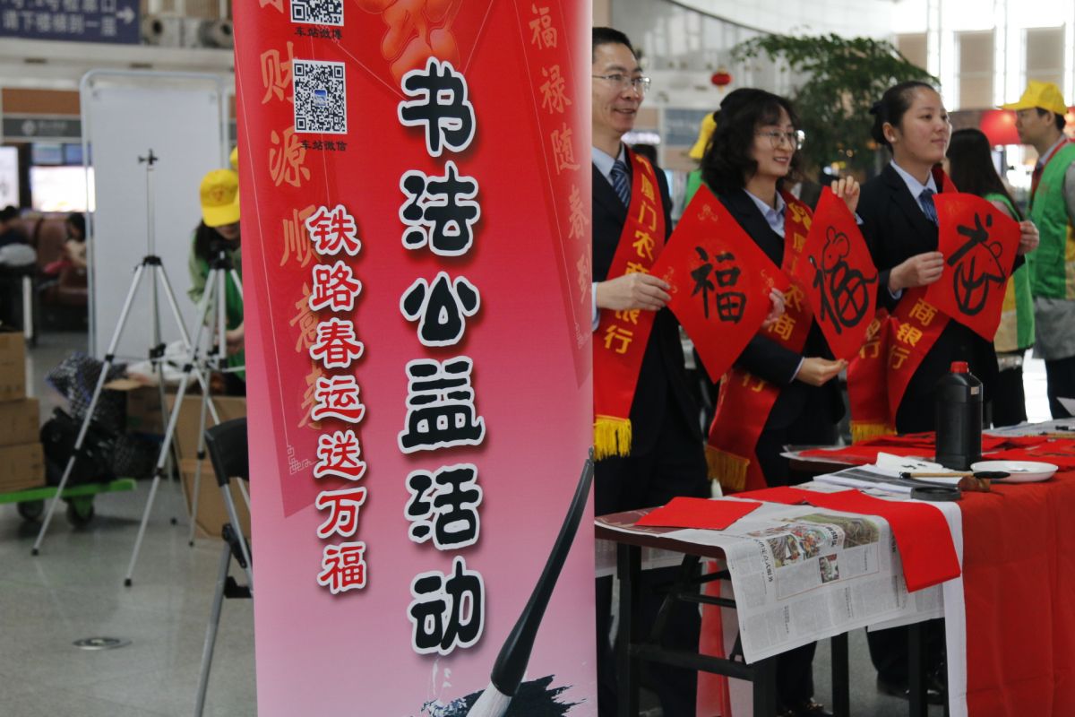 今年春运首日,厦门火车站联合厦门工商旅游学校、厦门大学附属心血管病医院等单位,一同为旅客献上了形式多样、内容丰富的文娱活动,其中木刻版画、手绘明信片、手写春联、免费义诊、爱心免费电话等活动受到广大旅客青睐。