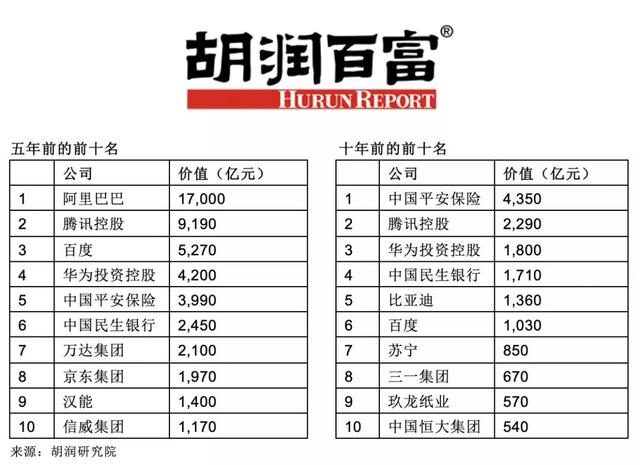 前十名中,总部广东的企业最多,有4家;其次是北京,有3家;排名第三的是浙江,有2家。前十名中有8家企业来自新兴产业,分布在电子商务、传媒与娱乐、大健康领域。有5家企业价值超过一万亿元。阿里巴巴以3.8万亿市值位列第一,腾讯以2.9万亿市值位列第二,平安保险以1.5万亿市值位列第三。胡润表示:“前五名由‘三马一任’创办,马云、马化腾、马明哲和任正非。”