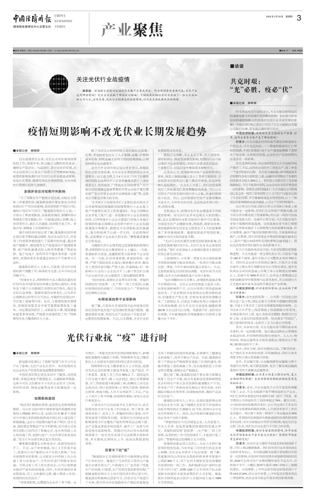 编者按 新冠肺炎疫情对我国经济发展产生重大冲击。作为新经济的重要代表,光伏产业受到哪些影响?光伏企业采取了哪些应对措施?中国经济时报记者近日采访了一些光伏企业和业内人士,总体来看,光伏行业短期受到疫情影响,但不改长期发展的良好趋势。