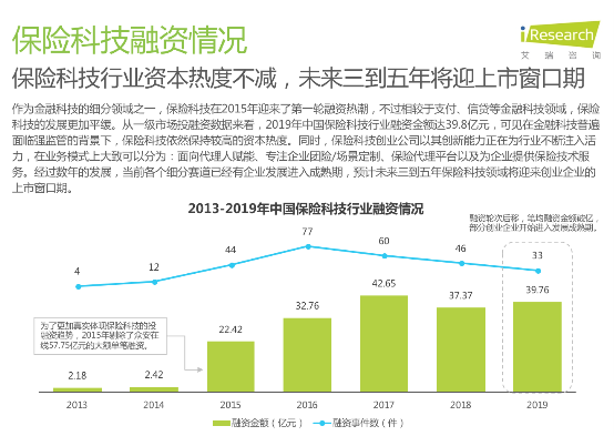 2、2019年中国保险科技融资金额达39.8亿,预计未来三到五年将迎来上市窗口期。