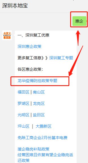 微信搜索并关注【深圳本地宝】公众号,在对话框发送【惠企】即可查看龙华区“疫情防控政策专题”入口、以及深圳各区公布的惠企政策详情,查询深圳租金优惠,另外,回复【肺炎】即可获取新冠肺炎密切接触者查询入口,查询全国新冠肺炎实时动态消息!