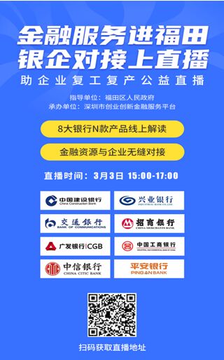 三是精准对接金融资源。为了精准匹配信贷渠道,工作小组通过市金服平台,经过深入评估和筛选,在多家银行业机构中确定8家有“战疫”金融专属产品且与福田区企业有较好合作历史的商业银行,并邀请最熟悉基层的普惠业务部门负责人或信贷产品经理作为直播嘉宾,确保金融服务更下沉基层、贴近底气。明天下午3点,“在线银企对接专场”,8大银行将对中小企业面对的普遍共性融资问题提供解决建议,对不同企业的具体困难进行在线答疑,企业扫描下图中二维码即可进入直播间。