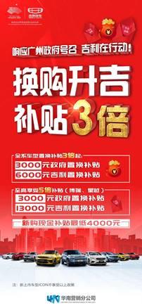 吉利汽车华南区域积极开展以“换购升吉,补贴3倍”为主题的换购行动,针对新购、换购消费者需求,吉利汽车全系车型钜惠升级。