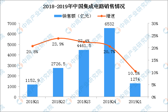 2019年第一季度全球半导体市场同比下降了5.5%。受到全球半导体市场下滑影响,中国集成电路产业2019年增速大幅下降,根据中国半导体行业协会统计,2019年第一季度中国集成电路产业销售额1274亿元,同比增长10.5%,增速同比下降了10.2个百分点,环比下降了10.3个百分点。其中:设计业同比增长16.3%,销售额为458.8亿元;制造业同比增长10.2%,销售额为392.2亿元;封测业增速下降幅度最大,增速环比下降了11个百分点,同比增长5.1%,销售额423亿元。