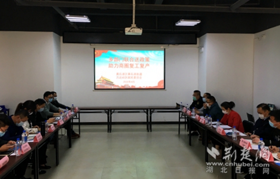 4月17日上午,黄石港街道万达社区邀请相关政府部门和万达商圈企业代表,组织召开复工复产惠企政策座谈会。(记者 吕鉴蕾 摄)