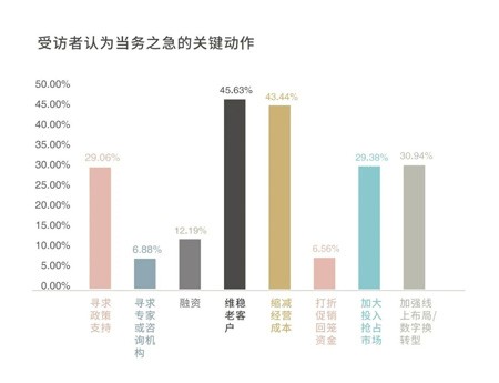 调查结果显示,疫情后多数企业选择的关键动作包括“维稳老客户”(45.63%)、“缩减经营成本”(43.44%),还有部分受访者选择“加强线上布局/数字化转型”(30.94%)以及“加大投入抢占市场”(29.38%)。采取保守措施的明显高于积极应对的,还有29.06%的受访者选择了“寻求政策支持”作为关键动作。访谈中,部分企业“等靠要”的意识较浓。