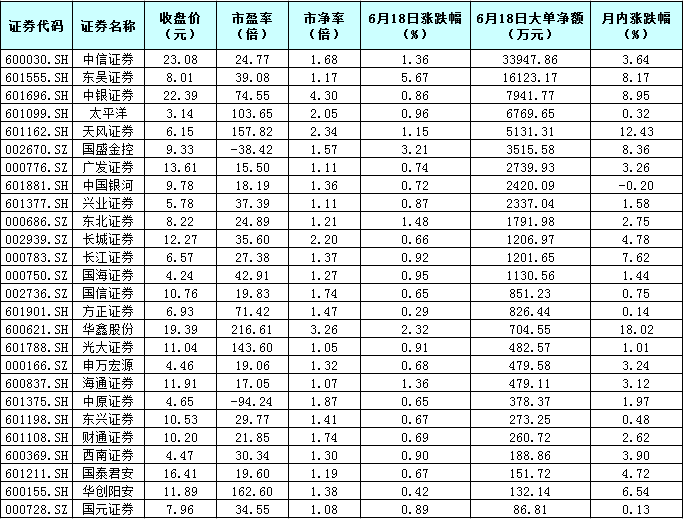 与此同时,手握真金白银的买方也颇为看好券商板块。仅6月18日一天就有9.16亿元大单资金抢筹26只券商股,其中,中信证券、东吴证券等两只个股大单资金净流入均超1亿元,分别为33947.86万元、16123.17万元,此外,中银证券、太平洋、天风证券等个股大单资金净流入也均在5000万元以上。